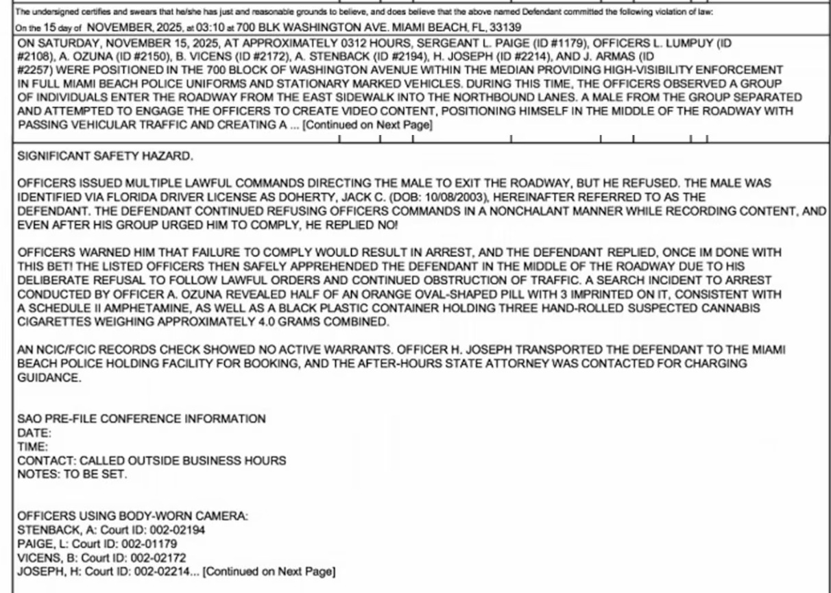 마이애미 비치 경찰 기록에 따르면, 잭 도허티는 토요일 오전 3시 10분경 워싱턴 애비뉴 700번지 부근에서 체포됐다. 해당 지역은 관광객과 유흥 인파가 많은 ‘South Beach Entertainment District’로, 새벽에도 사람이 붐비는 곳이다.